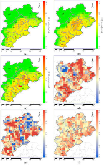 From 2005 to 2010 (Figure 2d), the HCHO concentration increased throughout most of Beijing-Tianjin-Hebei except for a selected few locations. The largest increase was observed in Chengde (i.e., the trend is 1.40 × 1013 molecules/cm2·month−1 with an RMSE about 2.6 × 1015 molecules/cm2). This might be due to the rapidity of urbanization and industrial development in China, including within the Beijing-Tianjin-Hebei region, which is accompanied by vast quantities of emissions that can cause serious air problems. Figure 2e shows the changes in HCHO VCDs through 2010 to 2015, which possibly reflect the strict reduction policies regarding VOCs that became public during that interval. Evident downward trends were found in Beijing, Cangzhou and Langfang at −7.39 × 1012 molecules/cm2·month−1, −1.80 × 1013 molecules/cm2·month−1, and −7.83 × 1012 molecules/cm2·month−1, respectively, especially in the heavily urbanized areas. HCHO columns in Chengde were largely reduced by about 17% during that period, although a VCD increase was observed therein between 2005 and 2010. In contrast, Zhangjiakou exhibited a distinct increase from 2010 to 2015, and about 35% in urban areas. This increase is likely due to the recent development of western Beijing-Tianjin-Hebei. In addition, although decreases were observed in northern sectors (e.g., Chengde) from 2010 to 2015, to gather a general picture in both periods, Beijing-Tianjin-Hebei, on average as suggested in Figure 2f, demonstrates an overall upward trend (5.20 × 1013 molecules/cm2·month−1 with a deviation of 3.6 × 1015 molecules/cm2) from 2005 to 2015. The findings are generally consistent with previous work, for instance, De Smedt et al. identified increasing HCHO columns in China [16]. Temporal and spatial discrepancies in HCHO distribution are complicated in mega-cities like Beijing [35]. Therefore, more specific analyses will be discussed later.