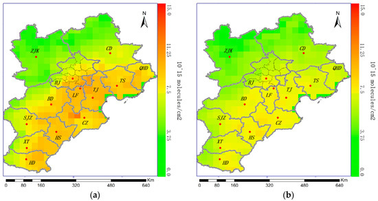 Additionally, the more industrialized cities show higher summertime columns, but a regional disparity was observed as well. The eleven-year averages over the whole prefecture-level-cities of Beijing and Shijiazhuang are 7.4 × 1015 molecules/cm2 and 8.8 × 1015 molecules/cm2, respectively. In contrast, the annual VCD averages in Chengde and Zhangjiakou are lower, i.e., approximately 5.9 × 1015 molecules/cm2 and 5.1 × 1015 molecules/cm2, respectively. The annually averaged VCD is relatively higher in urbanized areas, which are possibly characterized by more intense human activity. For example, the eleven-year averages in urban areas of Chengde and Zhangjiakou are 6.5 × 1015 molecules/cm2 and 5.0 × 1015 molecules/cm2, respectively.