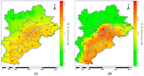 Figure 3c illustrates the HCHO distribution during the spring. Compared to that in the winter season, the coverage and VCD of the HCHO distribution in spring barely changes; however, a large zone of high HCHO concentrations appears in Beijing-Tianjin-Langfang. In spring, HCHO distribution is similar to that in autumn with an average of 6.7 × 1015 molecules/cm2 and a deviation of 2.1 × 1015 molecules/cm2. Figure 3d shows the HCHO distribution in summer, during which both the vegetation activity (e.g., isoprene) and sunlight intensity reach their peaks. The entire southern and eastern Beijing-Tianjin-Hebei region exhibits a very high HCHO concentration at 11.1 × 1015 molecules/cm2 with a standard deviation of 4.3 × 1015 molecules/cm2. The highest HCHO concentration was observed over southeast Beijing and surrounding areas (e.g., 16.6 × 1015 molecules/cm2 in Langfang). In addition, urban areas demonstrate relatively higher HCHO columns. For example, in southeast Beijing, a highly urbanized area, the average VCD is 12.9 × 1015 molecules/cm2 while the average VCD of the whole Beijing is 10.8 × 1015 molecules/cm2.