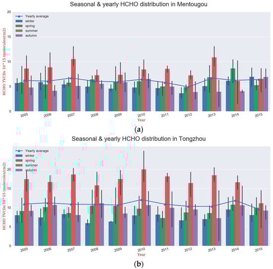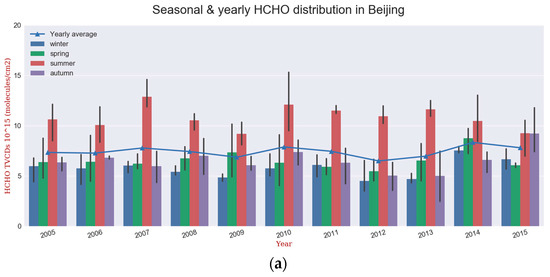 The seasonal features and patterns of the HCHO distribution are discernable for every year between 2005 and 2015. Figure 3 demonstrates the average seasonal tropospheric HCHO VCDs. Figure 3a shows the HCHO VCD distribution during the autumn season. The average VCD in autumn is 6.8 × 1015 molecules/cm2 and the standard deviation is 2.9 × 1015 molecules/cm2. High contiguous HCHO concentrations were observed primarily within the Beijing-Tianjin-Tangshan industrial area. Some high VCDs were also observed in the southern parts of the study area. Figure 3b depicts the HCHO VCD distribution during the wintertime with an average of 5.79 × 1015 molecules/cm2 and a deviation of 1.5 × 1015 molecules/cm2. Emissions during the winter season (e.g., in Beijing) are primarily derived from anthropogenic sources, as emissions from deciduous trees are enormously diminished [36]. Consequently, biogenic VOC photolysis is relatively inactive, and the distribution of HCHO is decreased substantially.