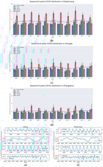 An overall increasing trend of HCHO columns from 2005 to 2015 was observed in this region. Specifically, due to rapid regional development, the HCHO columns increased from 2005 to 2010 over many areas of Beijing-Tianjin-Hebei and declined in the north (e.g., Chengde) from 2010 to 2015. This slight decline was potentially the result of strict regulations. In all sampling cities, according to the time series decomposition technique, HCHO VCDs declined steeply in 2013 and then increased rapidly. In terms of seasonality, HCHO in summertime demonstrated the largest concentration throughout the whole southeastern sectors. In addition, HCHO, assisted by calculating zonal statistics, in urban areas was observed with higher columns in stark contrast to the HCHO concentrations in rural areas.