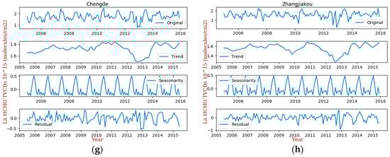 The moving average technique and time series decomposition are beneficial for differentiating trends and extracting cyclical patterns [33,37,38]. The lower sub-plots demonstrate the results of time series decomposition (i.e., the trend component, seasonal component and the residual component). The p-values of the first-order-difference series are 3.90 × 10−15, 1.43 × 10−13, 9.68 × 10−19 and 6.85 × 10−12 in Beijing, Shijiazhuang, Chengde and Zhangjiakou, respectively. The first-order-difference series was calculated based on the logarithms to original series, and the small p-values indicate that the results of decomposition are reliable. Except for the similar seasonal patterns, the trend components might reveal valuable details. As suggested, annual HCHO columns decreased since 2010 and significant upwards were found after 2012. Compared with corresponding summertime downward trends since 2013, the contributions from the other three seasons might have increased. Thus, inventories discussed in the next section are entirely possible to provide meaningful information.