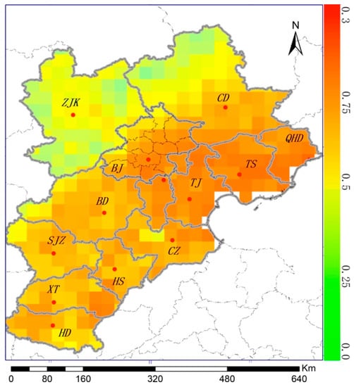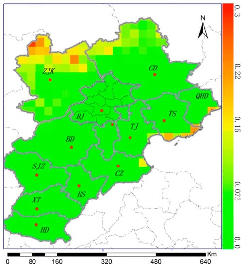 In the continental boundary layer, HCHO as a high yield intermediate reaction product of the VOC oxidation and the smallest and most abundant aldehyde of oxygenated VOCs, is mainly generated from the oxidation of short-lived biogenic and anthropogenic NMVOCs [41]. In this section, we will discuss biogenic and anthropogenic sources of HCHO, and whether direct HCHO emissions constitute a substantial contribution to pollution will be determined. Figure 6 shows the Moran’s I values for the tropospheric HCHO columns in the summer of 2010. Moran’s I is a measure of the spatial autocorrelation of data employed for geographical information science purposes, and it is characterized by the correlation of a pixel with its surrounding pixels [42,43]. The values of Moran’s I, which indicates the spatial autocorrelation of singular variables, reveal that the HCHO distribution is less correlated. Table 1 provides the Moran’s I for urban areas of the whole Beijing-Tianjin-Hebei region. The average Moran’s I of Beijing-Tianjin-Hebei throughout eleven years is 0.04. In each year, the Moran’s I value of almost every urban area throughout Beijing-Tianjin-Hebei was less than 0.3 (e.g., the highest was 0.28 in 2014, Zhangjiakou), which essentially represents the lack of correlation and suggests the absence of cluster centers. The short lifetime and low Moran’s I values of HCHO strongly imply that high HCHO VCDs might not originate from direct primary sources of emission because short-lived gases from direct emissions (e.g., anthropogenic NO2) would concentrate around their emission sources. Therefore, these results suggest that the summertime HCHO VCDs might be generated from secondary sources (i.e., VOC photolysis).