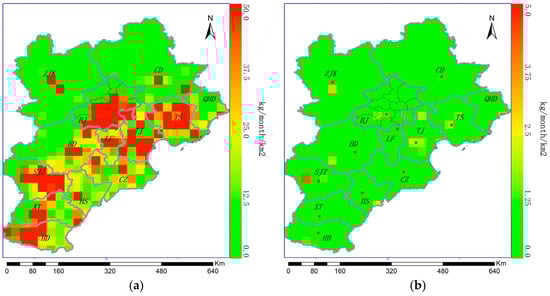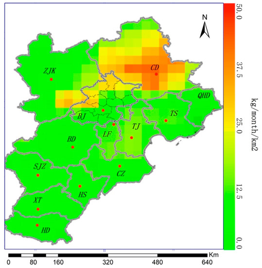 Residential and transportation emissions in urban areas are also higher than the prefecture-level-cities. For example, the ratio of urban emissions to prefecture-level-city ones is 2.22 for residential and 3.72 for transportation in Beijing. In addition, comparatively large cities have ratios larger than 1 (e.g., ratios in Tianjin and Shijiazhuang are all larger than 3.0). In relatively small cities, the ratio varies, and this might depend on many specific local factors. For residential sources, the emissions in urban areas increased in almost all cities with higher rates than emissions in prefecture-level-cities (e.g., 29.43% and 9.79% in Cangzhou, respectively). Meanwhile, transportation emissions decreased in almost all urban areas. Compared with residential sources, the difference of decreasing rates between urban areas and prefecture-level-cities varies more, suggesting that local factors might be important (e.g., city size, population and transportation conditions).