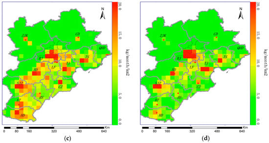 The residential sources as depicted in Figure 9c have a very similar distribution as the industrial sources but with much lower emission rates. The average residential emission rate is 4.61 kg/month/km2 with a standard deviation of 6.78 kg/month/km2, and the emissions are mostly concentrated in urban areas. However, the spatial PCC between HCHO VCDs and residential sources is the largest, indicating that residential sources are a potentially important contributor even though their emission rate is quite smaller than industrial and biogenic ones. As shown in Figure 9d, the transportation sources are sparsely located among the urban areas. The average is 3.79 kg/month/km2 and the standard deviation is 9.61 kg/month/km2. The spatial PCC of transportation is the second largest and no continuous trend was observed. This is possibly related to annual registered vehicle amounts and the control policies on gasoline quality.