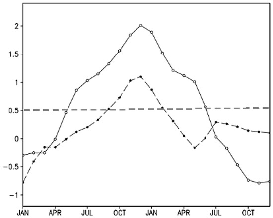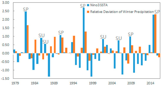 The winter precipitation amounts were larger than 40 mm·month−1 over South China and less than 40 mm/month over other parts of China (Figure 2a). In the present study, we focused on South China, where the winter precipitation amount was greater than 40 mm·month−1 and accounted for more than 8% of the annual total precipitation (Figure 2b). Anomalous winter precipitation in this region brings disastrous impacts, affecting the growth of crops and people’s daily lives. The temporal evolution of the Niño3 SST anomaly and relative deviations of winter precipitation over South China during DJF 1979–2016 is shown in Figure 3. The correlation coefficient between them was 0.60, which was significant at the 99% confidence level. It can be seen from Figure 3 that the winter precipitation in the spring El Niño events over South China was much higher than normal. Positive relative deviations of precipitation over South China occurred in periods of stronger spring El Niño events, such as 1982/83, 1991/92, 1997/98, 2009/10 and 2015/16. However, for the summer El Niño events, two cases (2002/03 and 2006/07) had small positive relative deviations, and another event (1986/87) had small negative relative deviations. It is worth noting that the number of events (5 spring and 3 summer El Nino) is very limited, and the statistical significance will be verified in the future.