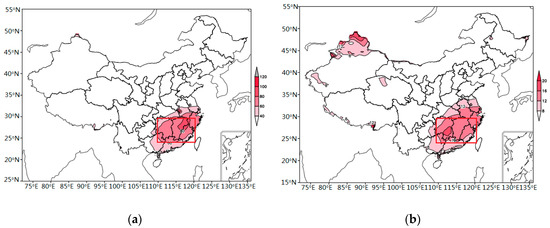 Averaged (a) monthly precipitation (units: mm·month−1; contour interval: 20 mm·month−1; shaded areas indicate precipitation above 40 mm·month−1) and (b) winter precipitation percentage (units: %; contour interval: 4%; shaded areas indicate precipitation percentages above 8%) during DJF 1979–2016. The red rectangle denotes the location of South China (22° N–30° N, 108° E–120° E).