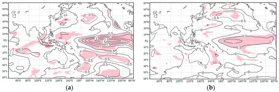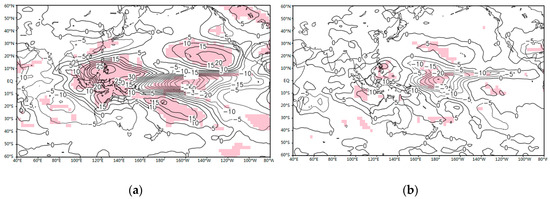 Composite OLR (units: W·m−2) anomalies during DJF 1979–2016 for the (a) spring and (b) summer El Niño events. The contour interval is 5 W·m−2. Shaded areas are statistically significant at the 95% confidence level, based on the Student’s t-test.