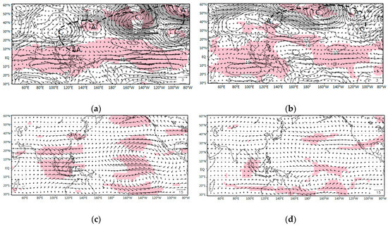 Composites of anomalies of (a) 700-hPa horizontal winds (units: m·s−1) and 500-hPa geopotential height (contours; units: gpm) and (c) 150-hPa horizontal winds (units: m·s−1) during DJF 1979–2016 for the spring El Niño events. Panels (b,d) show the same but for the summer El Niño events. The wind scale is shown at the bottom of the respective panels. The contour interval is 10 gpm. Shaded areas indicate statistical significance at the 95% confidence level, based on the Student’s t-test.