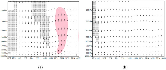 Composite anomalies of latitude–pressure cross-sections of meridional circulations (vectors) averaged along 110° E–130° E during DJF 1979–2016 for the (a) spring and (b) summer El Niño events. The units for meridional wind and vertical motion are m·s−1 and hPa·s−1, respectively. The values of vertical velocity are multiplied by −300. Shaded areas have an upward vertical velocity of ≥0.01 hPa·s−1. Dotted areas indicate statistically significant vertical velocity at the 95% confidence level, based on the Student’s t-test.