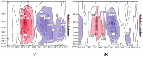 The lower-level and upper-level anomalous winds indicated a close connection between the atmospheric circulation over South China and that over the equatorial oceans. From another perspective, the regional meridional and zonal circulation changes were also important factors contributing to the lower-to-upper level connection. As shown in Figure 6a, the anomalous upward motion located at about 22° N–30° N tended to weaken the local Hadley cell in the spring El Niño events, which was not the case in the summer El Niño events (Figure 6b). It is well-known that over the tropical Pacific, the dominant zonal circulation is the Walker circulation. The above pronounced positive SST anomalies in the EEP produced a strong anomalous downward motion over the WEP, as depicted in Figure 7a. This anomalous downward air, combined with the lower-level anomalous westerly (Figure 5a) and upper-level anomalous easterly (Figure 5c) over the WEP, weakened the Walker circulation and in turn induced a significant ascending anomaly over South China (Figure 6a). In the summer El Niño events (Figure 7b), the positive SST anomalies in the CEP produced strong anomalous upward motion near the date line and downward motion over the WEP, which was weaker than that of the spring El Niño events.