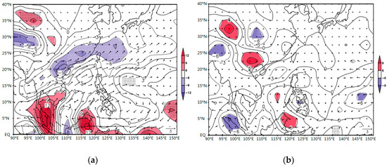 The anomalies of OLR were examined to demonstrate the hypothesis. OLR is a good proxy for the convective activity in the tropics. In the spring El Niño events (Figure 8a), significant positive OLR anomalies appeared over the WEP to the SCS, while significant negative anomalies occurred over the CEP and South China. For the summer El Niño events (Figure 8b), however, the distribution of OLR anomalies was very different from that of the spring El Niño events. The negative OLR anomalies covered the WEP to the SCS, while the positive OLR anomalies over the CEP were weaker and with a smaller coverage area. The distribution of OLR anomalies over South China in the spring El Niño events showed that there was a significant anomalous upward motion over the region, and the convective activity was more active than that of the summer El Niño events. This feature was consistent with the anomalous SST anomalies (Figure 4a) in these regions. Whereas, for the summer El Niño events, the aforementioned anomalies became weaker.