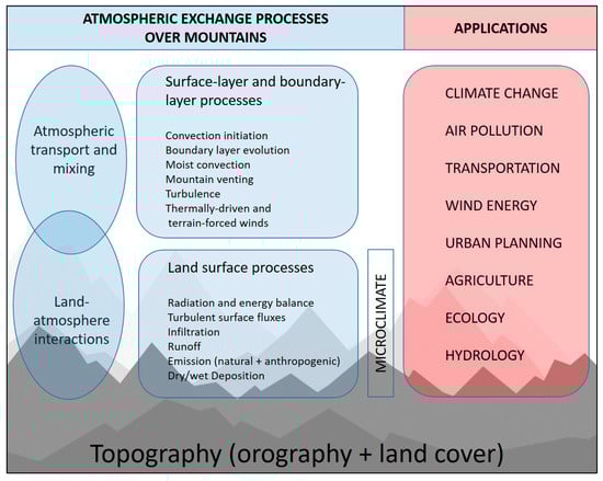Mountains affect land-atmosphere interactions and atmospheric transport and mixing of mass, momentum, and heat over a wide range of temporal and spatial scales. Collectively, we refer to these as atmospheric exchange processes over mountains. Extensive recent reviews of this subject are available in [1,2]. Atmospheric exchange processes drive many aspects of weather and climate, including diurnal changes in atmospheric variables such as temperature, humidity, wind, and air pollutant concentrations near the surface. Good understanding, observation, simulation, and forecasting of these variables is important for meteorological applications related to many scientific disciplines and sectors of the economy, including the earth system sciences (e.g., hydrology and ecology), water resource management, agriculture and forestry, construction, urban and regional planning, renewable energy, transportation, air quality, and climate change. To emphasize that we discuss scientific disciplines and sectors of the economy in the context of meteorological applications, we will refer to these disciplines and sectors as ‘applications’. The goal of this paper is to identify some of the benefits of an improved understanding of exchange processes in mountainous terrain to a selection of applications. We present some specific examples of applications that not only use current knowledge of atmospheric exchange processes over mountains, but also motivate their continued investigation. Therefore, our aim also is to stimulate discussion and a vision towards the future.