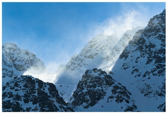 While the spatial heterogeneity of the snowpack has a direct impact on hydrologic applications and turbulent exchange, the redistribution process itself results in a substantial loss of water from a basin through sublimation [29,30]. Blowing snow (Figure 2) has an exposed surface area that is orders of magnitude larger than snowpack’s surface area. This combines with the highly turbulent environment to result in estimates of sublimation losses as high as 1000 mm of water along ridges [31]. However, very few measurements are available to constrain these estimates. While the importance of modeling redistribution as a component of alpine hydrology has been recognized for a long time [32,33,34], explicit modeling of snow redistribution has a much shorter history [35,36]. Explicit simulation of the complex wind fields controlling this redistribution [14,15,30,37] and an understanding of the coupling between the near-surface atmospheric turbulence in complex terrain and the snow transport dynamics [38] are only in their infancy. Understanding the transport and exchange of snow in the alpine boundary layer is crucial for helping water resource managers to better estimate the volume and timing of runoff expected in a given year.
