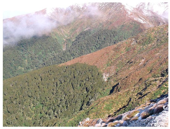 Mountain ecosystems are characterized by large gradients in elevation and climate that affect the distribution of flora and fauna, and are therefore rich sources of biodiversity and ecosystem services (such as carbon sequestration, flood regulation, and pest control). Climate variables often have important covariances embedded in their spatial structure over mountains, which also affect vegetation distribution. For example, in water limited ecosystems, vegetation tends to grow on north facing slopes, while in energy limited systems, vegetation growth favors south faces. Among other factors, mean annual temperature is the main factor determining the range of different plants [41]. For example, the alpine tree line (Figure 3) occurs around the 10 °C summer isotherm [42]. Therefore, in tropical regions, the tree line may be above 4000 m, whereas at high latitudes it may be as low as few hundred meters [43]. Tree lines and snow lines occur at higher elevations in the interiors of mountainous areas than at the outer margins. This observation has been explained using the so-called “Massenerhebung” (mass elevation) effect [44], which is partly due to spatial variations in atmospheric heat exchange over the mountains. This effect has important implications in ecological studies but has so far not been quantified in terms of atmospheric exchange processes.