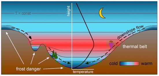 Frost is one of the most relevant damage factors for crops in mountainous areas and can destroy fruit and vegetable harvests. Radiation frost is produced mainly by local surface-atmosphere exchange processes in topographic depressions, while advection frosts are caused by the advection of cold air by local and larger-scale winds at higher elevations. The hazard posed by late frosts can be increased by early-blooming due to higher winter temperatures in a warming global climate [62]. Any improvement in our ability to forecast radiation and advection frost can support farmers in the management of frost protection systems. An example where understanding of microclimate and exchange processes in mountainous terrain has benefited agriculture is the existence of thermal belts [63,64]. These layers of relatively warmer air that occur over the slope at night at the top of the valley temperature inversion locally lengthen the growing season and enable crops to grow on slopes in regions where the climate is otherwise unsuitable (Figure 4).