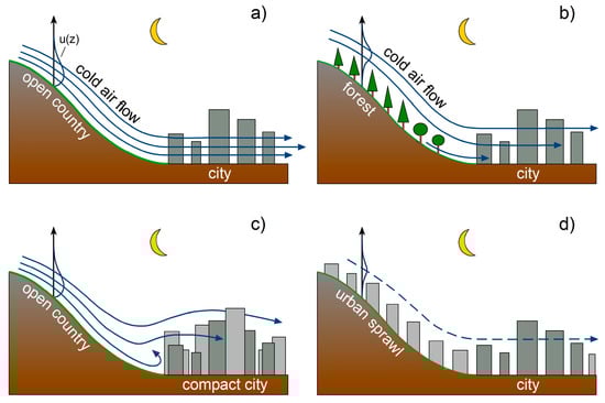 Schematic representation of nocturnal drainage wind ventilation in cities with different surrounding landscapes and urban planning scenarios. (a) Well ventilated city surrounded by open country with strong formation of local cold air; (b) Nocturnal ventilation of a city surrounded by forest with cold air formation at tree crown level; (c) A compact city with preservation of surrounding open country: the higher density among buildings causes blocking and lifting of drainage winds; (d) Urban sprawl scenario: strong reduction of rural cold air and drainage wind formation. Blue lines indicate streamlines and vertical profiles of nocturnal drainage winds. Green lines indicate low surface vegetation over the hillslope. Existing buildings and planned buildings are shown in dark and light grey, respectively.