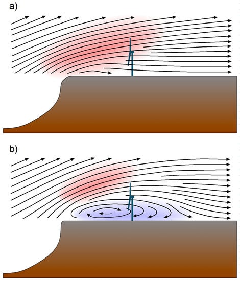 Airflow illustration of the mean flow field over topography with a rounded edge (a) and a sharp edge (b). Red and blue shading indicate areas with strong and weak horizontal winds, respectively. Adapted from [86].