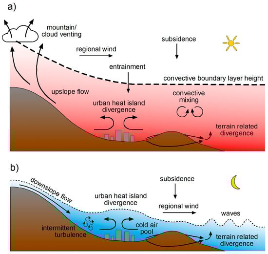 Schematic representation of processes affecting the dispersion of air pollutants in an unstably (a) and stably (b) stratified boundary layer over complex terrain. Note that similarities between daytime and nighttime situations are the synoptic-scale subsidence, the urban heat island divergence (caused by the relatively warm urban areas compared to the surrounding areas), the regional wind, and the terrain related divergence (caused by the westerly regional wind).