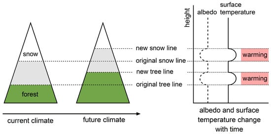 A positive albedo feedback mechanism to explain elevation dependent warming due to climate change. Climate change decreases albedo at altitudes with upslope propagating snow- and tree lines. A decrease in surface albedo changes the surface energy balance causing an increase in surface temperature (partially adapted from [26]).