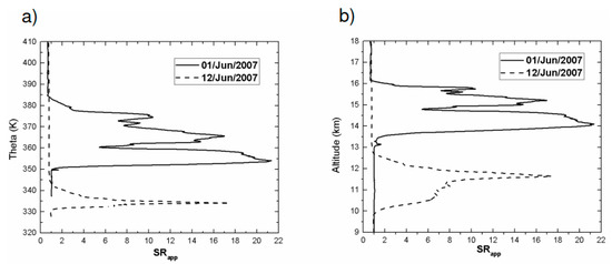 SRapp profiles on 1 June (solid line) and 12 June (dashed line) 2007 derived from the São Paulo lidar, according to the potential temperature (from local radiosounding) (a) and the corresponding altitudes (b).