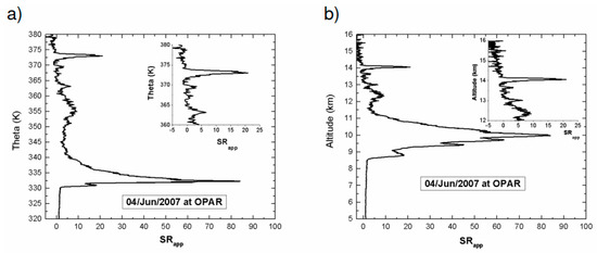 SRapp profile observed by the lidar at Maïdo on 4 June 2007 at ~16h 50 UTC, according to the potential temperature (from ECWMF-ERA-Interim (Dataset of global atmospheric reanalysis stated as European Centre for Medium-Range Weather Forecasts Re—Analysis continued since 1979)) (a) and the corresponding altitudes (b).