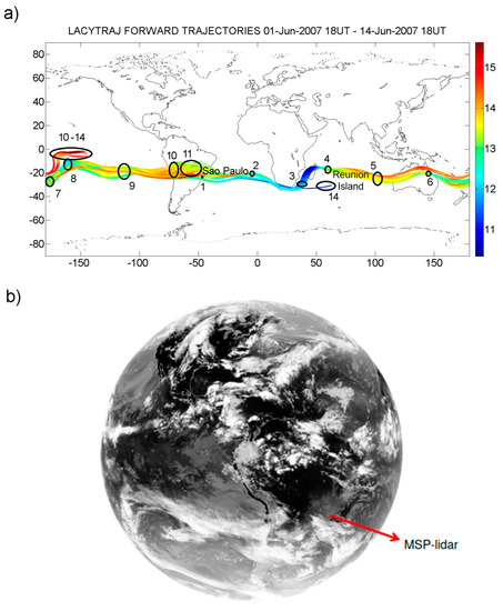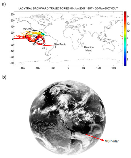 (a) Backward trajectories corresponding to the cirrus cloud detected by metropolitan city of São Paulo (MSP)-lidar on 1 June 2007 at São Paulo. Colors indicate the air masses altitudes (in km), and the numbers indicate the day of May–June 2007 corresponding to the location of the air masses. (b) METEOSAT (METEOSAT—Meteorological Satellite (METEOSAT) series of satellites are geostationary meteorological satellites operated by EUMETSAT (European Organization for the Exploitation of Meteorological Satellites) under the Meteosat Transition Program (MTP) an the Meteosat Second Generation (MSG) program) InfraRed (IR) at 18 UTC on 1 June 2007.
