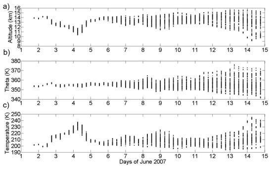 Temporal evolution of (a) altitude (in km, deduced from pressure level) and thermodynamic parameters; (b) theta (in K); and (c) temperature, interpolated on LACYTRAJ forward trajectories points during 15 days (1 to 15 June 2007).