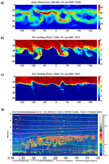 The wind field at 200 hPa (~12.5 km) on 1 June 2007 (Figure 6a), shows a pronounced jet around at the 25–35° S latitude band, mainly over South America (with anomalies on its eastern part), in Africa, and in the middle of the Indian Ocean at the latitude of India. In those three areas, the jet was deflected into two parts: a weak one towards the north, reconnecting the jet afterward, and a stronger branch reconnecting the jet after a large southern loop. Such synoptic context is similar to the situation of the multiple stratospheric intrusion events in April 2013 above the Indian Ocean, where some isentropic transport was associated with Rossby wave breakings guided by both subtropical and polar jet streams [33].