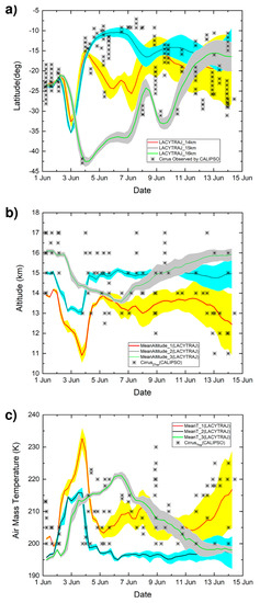 Track matching between CALIPSO (presence of cirrus detected) and LACYTRAJ air mass trajectories during 14 days in a latitude range of −45° to −5°. The corresponding latitude (a), altitude (b), and temperature (c) of cirrus extracted from CALIPSO are shown for the same period. The shaded area on the modeled curves represents the standard deviation.