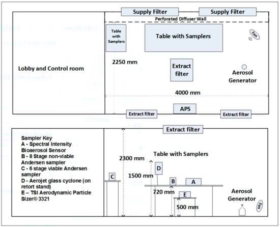 The characterisation of bioaerosol emissions from commercial compost was carried out in a controlled test chamber (Figure 1). The walls and ceiling are constructed from panels, faced with white, food-safe, unplasticised Polyvinyl Chloride (UPVC) laminated, zinc coated sheet steel. The test chamber had a volume of 20 m3 and was supplied with a horizontal flow of clean air from a bank of high efficiency particulate air (HEPA) filters, positioned behind a diffuser wall. These filters fed a combination of fresh air and recirculated HEPA filtered air from the chamber. A separate extract filter mounted centrally within the ceiling, drew a small fraction of air to maintain negative pressure and allow for the introduction of fresh air. The chamber is designed to allow the operation of equipment and services remotely from an anteroom, allowing for procedures to be undertaken without staff being present in the test space. The chamber is designed to achieve up to 250 air changes per hour, providing very high levels of air cleanliness and rapid removal of test aerosols.