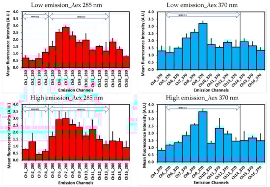 Representative fluorescence intensity across different emission channels for two excitation wavelengths during low and high emission scenarios. Bars = standard deviation.