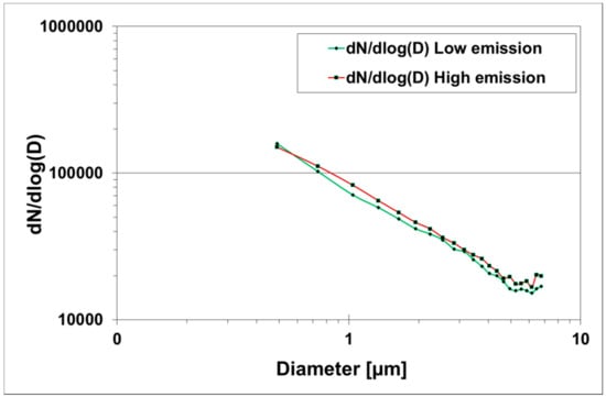 Size distribution of fluorescent particles in the samples analysed for fluorescence spectra under low and high emission scenarios.