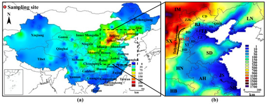The location of the sampling site in SJZ. (a) The spatial variations of PM2.5 concentration (μg/m3) in China during the monitoring period; (b) the elevation (m) distribution of the North China Plain (CD: Chengde; ZJK: Zhangjiakou; QHD: Qinhuangdao; TS: Tangshan; LF: Langfang; BD: Baoding; CZ: Cangzhou; HS: Hengshui; SJZ: Shijiazhuang; XT: Xingtai; HD: Handan).