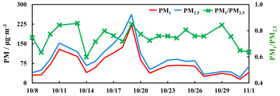 Time series of daily PM concentration and PM1/PM2.5 ratio during the study period.
