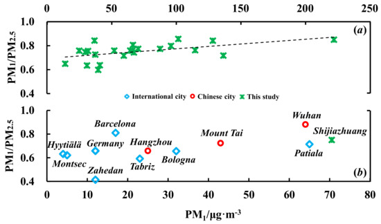 The ratio of PM1/PM2.5 as a function of PM1 concentration in this study (a) and in other studies (b).