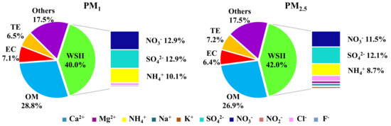 The profiles of chemical components in PM1 and PM2.5. (TE: trace elements; EC: elemental carbon; OM: organic matter; WSII: water-soluble inorganic ions).