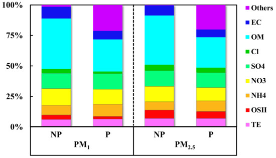 A comparison of chemical composition fractions in different pollution levels is presented in Figure 5. It can be seen that the dominant component in the non-polluted period was OM (41.3% in PM1, 40.4% in PM2.5), and SIA in the polluted period (35.0% in PM1, 31.8% in PM2.5). Additionally, the variations of SIA contribution from NP to P increased by 0.8% in PM1, and decreased by 0.5% in PM2.5, indicating the vital function of SIA in the formation of submicron particulate pollution. The decrease of SIA fraction in PM2.5 may be ascribed to the high proportion of unknown components (named Others in Figure 5), which was likely to be aerosol liquid water related to particle hygroscopicity, and especially to the aqueous-phase reactions of the pollutants in accumulation mode during haze episodes [68]. The percentage of OM in different diameter ranges concurrently decreased even if the mass concentration still increased, consistent with observations from the Yangtze River Delta [38], probably attributed to the extraordinarily percentages of SIA [69]. Alternatively, a weak oxidizing ability of air to organic matter during the haze period may also cause a weak formation of local secondary organic aerosols [70].