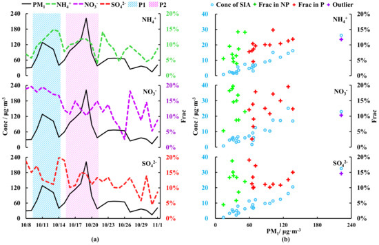 A further analysis was carried out on the relationship between SIA ions in two typical haze pollution episodes during the study period (Figure 6). The first pollution period (P1) was from 9 to 14 October. Only the mass fraction of NH4+ had a relatively synchronous variation with PM1 concentration (Figure 6a), compared with SO42− and NO3−. The pollution degree had no further deterioration, indicating the contribution from accidental sources during P1. The second pollution period (P2) from 15 to 21 October was much more serious than P1, with the maximum concentration of PM1 reaching 222.34 μg/m3. As shown in Figure 6a, NH4+ and SO42− exhibited synchronous variation with PM1 concentration, implying the formation of (NH4)2SO4 and/or NH4HSO4. The [NO3−]/[SO42−] ratio of 0.90 suggested that coal combustion may be one of the main sources of heavy haze episodes in SJZ.