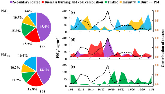 Factor 1 was characterized by the high loading of NH4+, NO3−, and SO42−, and was identified as secondary source (SS), accounting for the largest contribution of 45.4% to PM1, 3.0% higher than PM2.5, which probably resulted from the size distribution of smaller-diameter secondary components [60]. The time series of contributions from SS (Figure 7d) peaked in the two heavy haze periods, in accordance with the variations of PM1 concentration, confirming the major contribution of secondary transformation for PM1 pollution in SJZ.