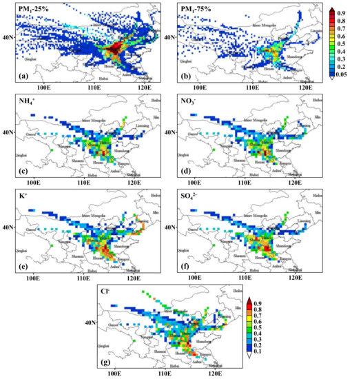 Potential source contribution function (PSCF) analysis results for regional contributions to SJZ under the criterion of 25th percentage PM1 concentration (a), and 75th percentage PM1 concentration (b), NH4+ concentration (c), NO3− concentration (d), SO42− concentration (e), K+ concentration (f), and Cl− concentration (g).