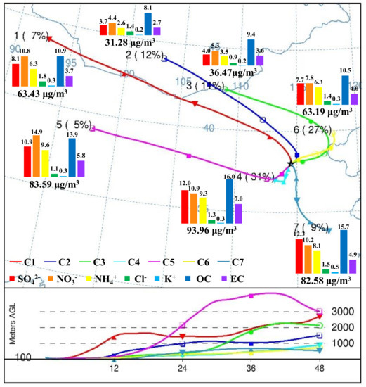 C7 was another curving pathway from the southeast of SJZ. It was probably shaped by the special terrain (plain is surrounded by mountains in west and south) of NCP, including Henan, Shandong, Anhui, and Jiangsu province (Figure 1b). As well as for SIA and OC, C7 also had a relatively higher concentration of K+ (0.53 μg/m3) compared with other clusters, and as K+ is widely used as the tracer of biomass burning source, this result indicates a considerable contribution of biomass burning from southern NCP to SJZ. This observation was consistent with the conclusion made in Section 3.3. Heavy agricultural activities in the passing regions of C7 could explain the high concentration of PM1 of C7.