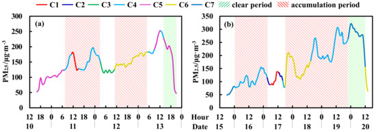 In order to identify the contributions of each cluster to haze episodes in SJZ, two heavy polluted events (peak PM2.5 concentration >150 μg/m3), which happened during the study period, were chosen to analyze the detailed processes (Figure 10). Because of the lack of hourly PM1 data, hourly PM2.5 concentrations were collected from the published data of the Ministry of Environmental Protection [92] for the further analysis. P1 occurred between 16:00 on 10 October and 20:00 on 13 October, with a duration of 77 h and a peak PM2.5 concentration of 253 μg/m3 (Figure 10a). P2 occurred between 18:00 on 15 October and 14:00 on 20 October, with a duration of 117 h and a peak PM2.5 concentration of 321 μg/m3 (Figure 10b). It can clearly be seen that during the pollutant accumulation period (in red shadow), C4 and C6 were the major contribution clusters both for P1 and P2, confirming the analysis discussed above. Additionally, C5 and C7 were probably other potential transport paths for pollutants for P1 and P2, respectively, because these two pathways raised the concentration of PM2.5 from NP to P condition at the beginning. For the clear process of pollutants (in green shadow), there was a difference between P1 and P2. The relatively clean airflow from C5 decreased the PM2.5 concentration of P1. In P2, the airflow from C7 may reduce the severity of the heavy haze.