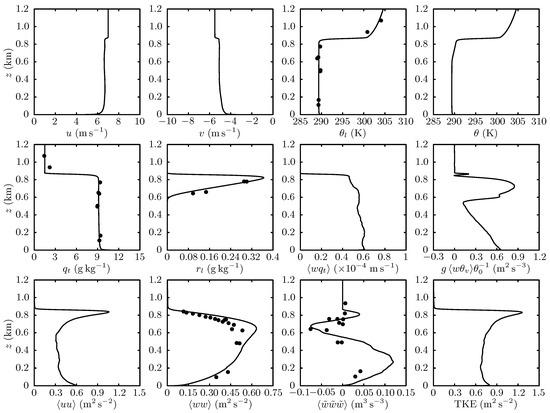 Similar to other LES results [13,33], is positive below the inversion, whereas observations do not include positive values in the same region. The vertical velocity triple correlation can be related to the relative strength between updrafts and downdrafts. Kopec et al. [35] compare the sign of mean and median of and conclude that strong but narrow updrafts are present in the cloud. The profiles of updraft and downdraft area fractions and the decomposition of covariances for the present case are discussed in [36].