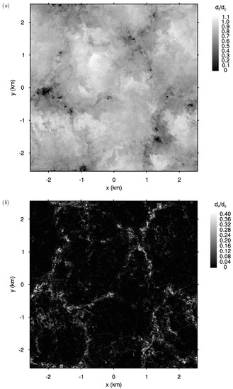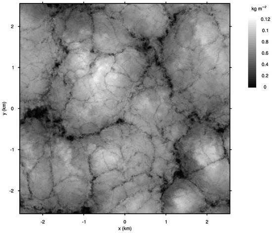 Previous studies of small-scale (1–) cloud liquid variability relied on in situ airborne measurements [37,38,39,40,41,42,43] or radar observations [44]. The observational data sets are either one dimensional (along flight paths) or two dimensional (z–t pairs in radar observations), thus the horizontal fine-scale variability of the cloud is not readily apparent. Figure 2 shows the rich multiscale structure of LWP in the LES. The characteristic “lumpy” structure of the cloud is interlaced with elongated regions of very low LWP.