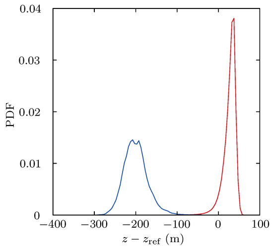 Whereas Figure 2 and Figure 3 explore the spatial structure of the cloud, Figure 4, Figure 5 and Figure 6 show the statistical distribution counterparts. Figure 4 shows the probability density function (PDF) of LWP, i.e., the normalized histogram. Figure 5 shows the PDF of the cloud base and cloud top heights with respect to the reference height and Figure 6 the PDF of the normalized total cloud void depth. Because most columns have low values, the PDF of is plotted in logarithmic scale.