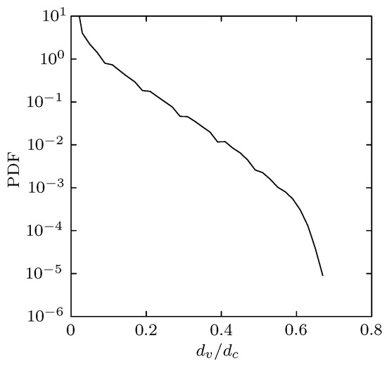 The PDF (Figure 6) exhibits nearly scaling, where c is a constant, for a wide range of . Because, only one condition is presently explored and given the variations in the LWP PDF in the numerical experiments of [35], it cannot be concluded that the observed PDF is characteristic of a broader range of stratocumulus.