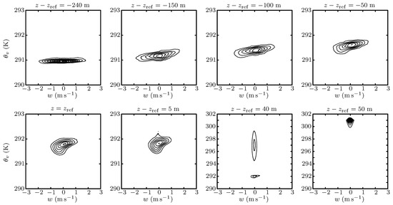 For all JPDs show typical convection characteristics with an approximate joint Gaussian shape [36,51]. The influence of entrainment of free-tropospheric air is first observed at . In a thin layer of approximately the JPDs transition from their boundary layer values to zero-covariance free tropospheric JPDs. At about the JPDs are double peaked (not shown in the w– JPD contours of Figure 7). The vertical velocity distribution width decreases significantly for and the JPDs become narrower in the w coordinate, c.f., profiles in Figure 1.