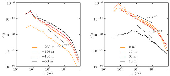 Radial spectra of liquid water mixing ratio at various heights with respect to the height of the maximum mean cloud liquid . Left panel corresponds to spectra for and right panel to . The black straight lines denote ∼ and ∼ scalings. The x-axis labels are converted to length scale to aid the physical interpretation of the spectra.