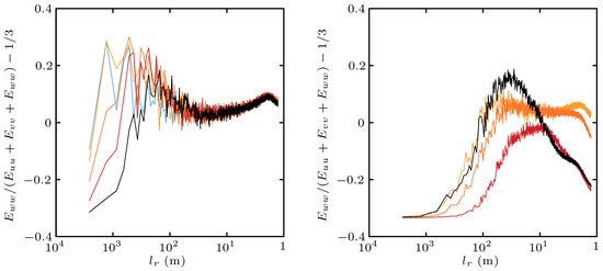 Radial spectra of u, w, , and are computed from the LES by taking the two-dimensional Fourier transform, e.g., for , and then averaging across radial wavenumber “shells” to form . The x-axis in Figure 10, Figure 11 and Figure 12 is converted to length scale to help the interpretation and comparison to previous studies [38,39].